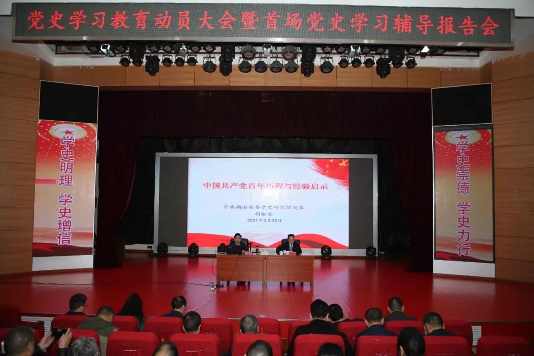 动员会后,我校举行了首场党史学习教育专题辅导报告会,中共湖南省委党史研究院院长胡振荣为我校师生作了题为“中国共产党百年历程与经验启示”专题辅导报告。他从救国、兴国、富国和强国四个阶段回溯了中国共产党百年奋斗历程,指出中国共产党百年历史的主题和主线是争取民族独立、人民解放和实现国家富强、人民幸福;中国共产党百年历史主流和本质就是不懈奋斗史、为民服务史、理论创新史、精神锻造史和自我革命史,为在场师生党员生动的诠释了中国共产党为什么“能”、马克思主义为什么“行”和中国特色社会主义为什么“好”三大问题。