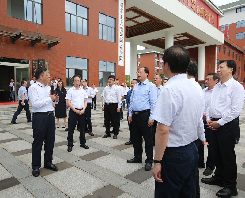 走进瓷都醴陵,毛伟明第一站来到我校醴陵陶瓷学院,参观了熊希龄广场,认真听取了我校党委书记谭益民关于醴陵陶瓷学院办学历史、办学特色和办学成效的汇报。在学院陶瓷艺术馆,他详细了解醴陵釉下五彩瓷的特色和发展历史,观看琳琅满目的陶瓷制品和学生的文创作品。