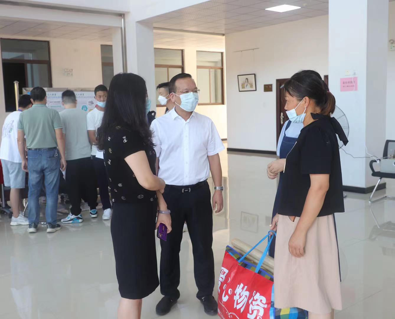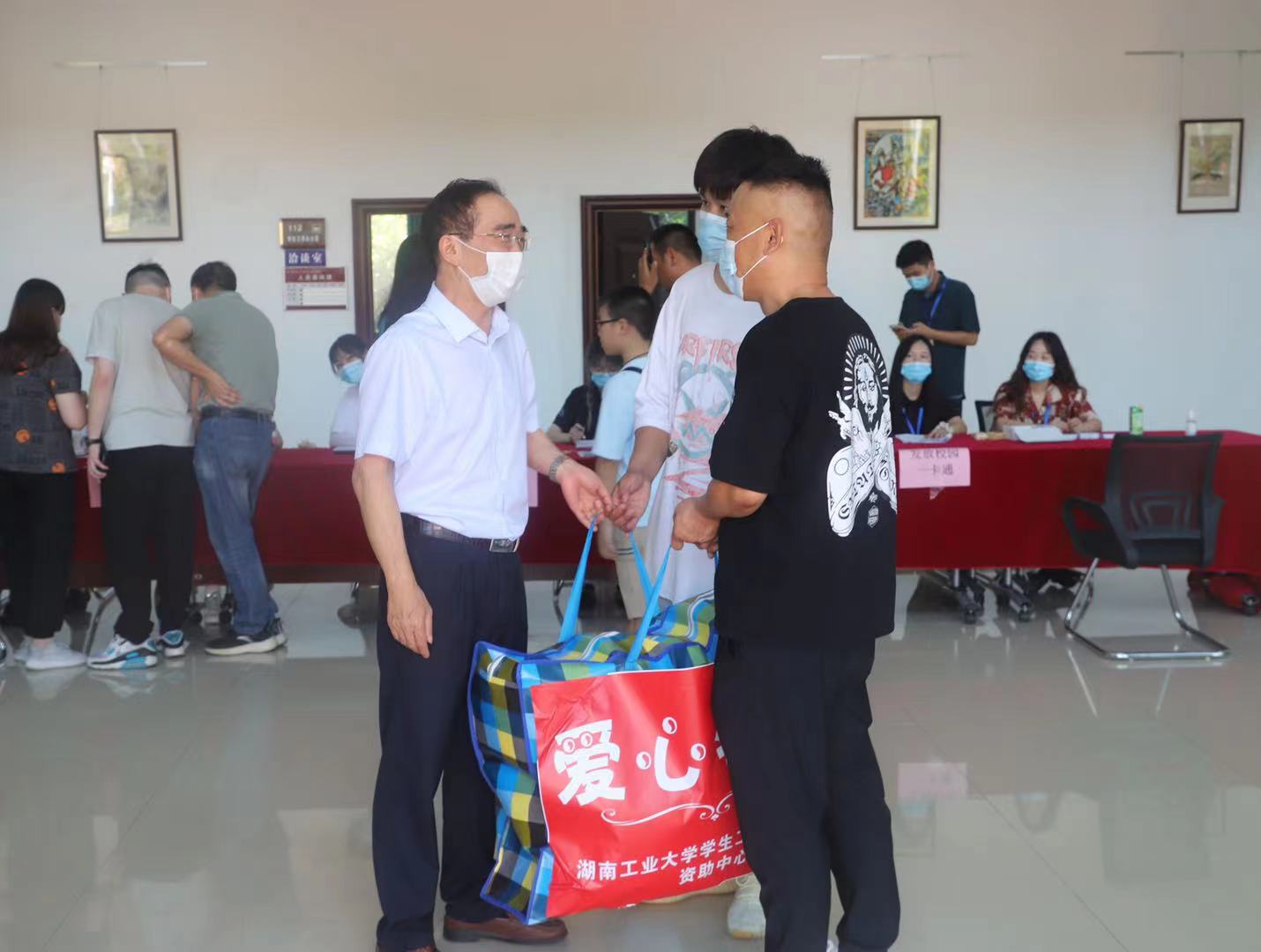 在我院迎新点,校领导一行视察了我院的迎新准备工作情况,佘朝文、蒋建初还与来自贫困地区的新生亲切交谈,详细了解他们的录取专业和家庭,并为他们送上爱心物资,希望他们尽快融入大学生活,努力成才,回报社会。