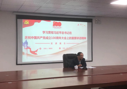 10月13日下午,湖南工业大学党委委员、副校长蒋建初以《学习贯彻习近平总书记在庆祝中国共产党成立100周年大会上的重要讲话精神》为主题,在我院实训楼211教室给全体教师带来了一场精彩生动的专题党课宣讲报告,创新创业学院与高教所全体党员一同参加此次活动。