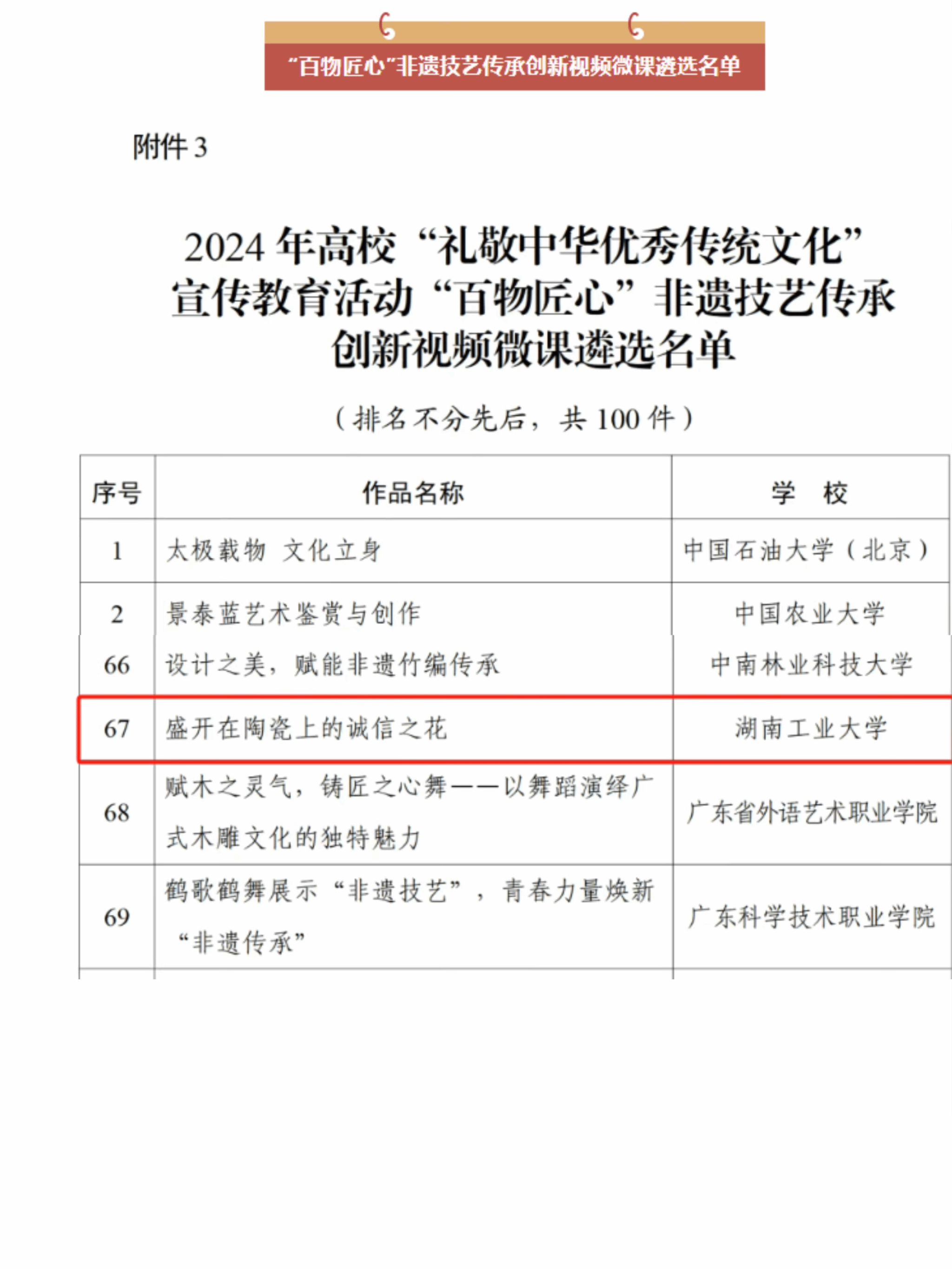 近日,教育部办公厅公布2024年高校“礼敬中华优秀传统文化”宣传教育活动结果,我院现代陶瓷工艺与制造技术湖南省科普基地负责人郝建英团队报送的视频微课作品“盛开在陶瓷上的诚信之花”入选100门“百物匠心”非遗技艺传承创新视频微课名单。