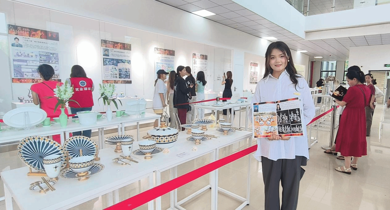 展厅内,陶瓷艺术设计专业毕业生的众多作品令人目不暇接,作品涵盖釉下五彩瓷、现代陶艺、陶瓷文创等多元领域。关同学的《釉火流纹》系列餐具,巧妙地解构了醴陵传统龙纹,以现代几何线条重新演绎,搭配环保陶土材料,将文化底蕴与实用功能融为一体;王同学的《瓷语智能》装置作品,通过将陶瓷与传感器的结合,让静态器物“讲述”醴陵窑火故事,展示了非遗技艺在当代的创新转化魅力。这些作品既是学生们四年的智慧结晶,也成为连接学院教育与产业需求的重要纽带。