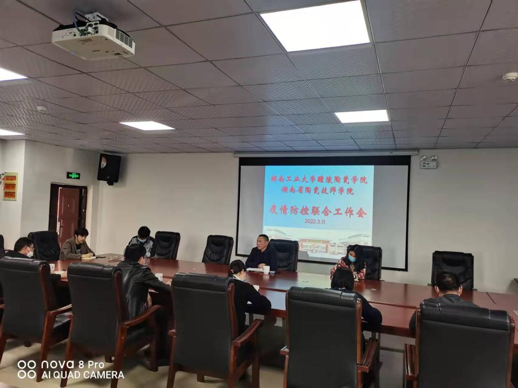 3月11号下午3点,我院与湖南陶瓷技师学院在实训楼211召开疫情防控联合工作会。院长易小斌主持会议,学院全体教职工、陶瓷技师学院相关领导参加会议。