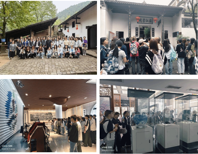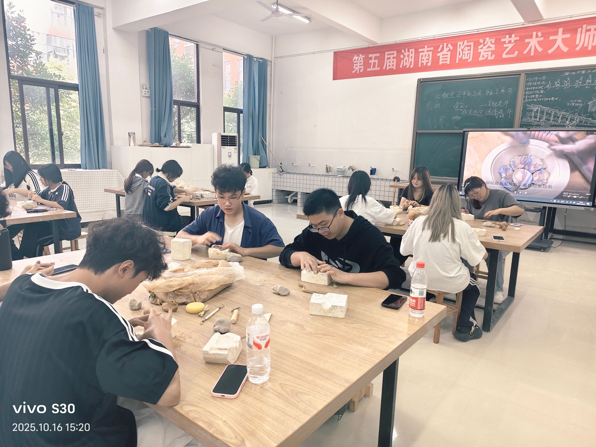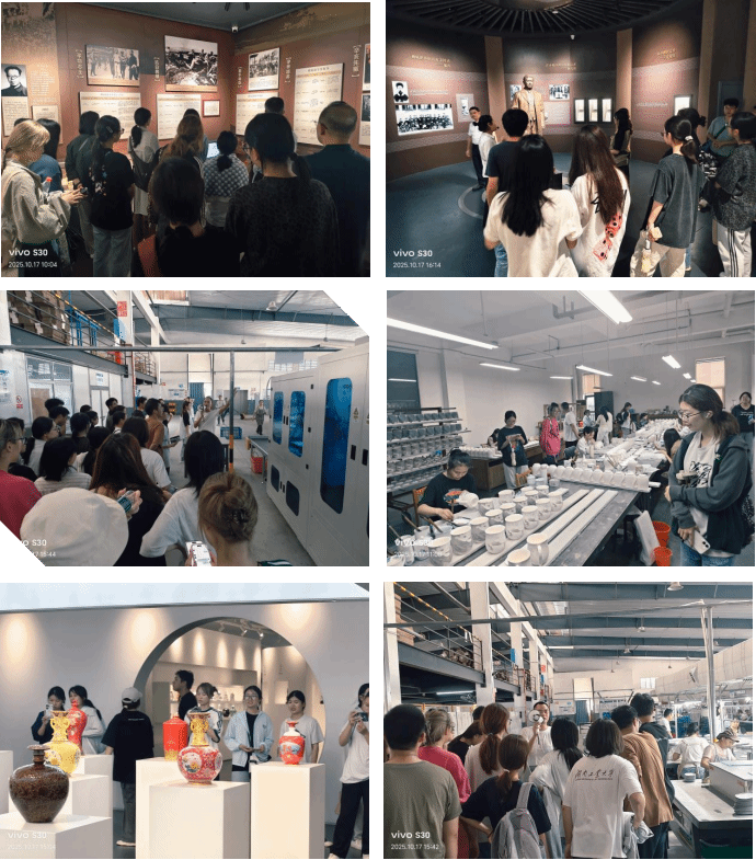 《陶瓷专业导论》是陶瓷艺术设计专业新生的大学第一课,在完成相关专业知识的课堂学习后,进入了满怀期待的实践教学环节,2025年10月16-17日,在任课教师郝建英和刘峰的带领下,同学们先后来到中国陶瓷历史文化名村——沩山村、国家一级博物馆——醴陵陶瓷博物馆和千年书院——渌江书院等地进行参观学习,深入了解醴陵地域文化和陶瓷发展历史,缅怀革命先烈;接着到新世纪艺术馆、醴泉窑艺、华联瓷业等知名陶瓷企业进行参观学习,了解不同产品特色和生产工艺流程。数以万计的形态各异的陶瓷酒瓶、三米多高的手绘釉下五彩高温瓷板画、充满异域色彩的出口瓷,智能智造车间生产线上井然有序的数控机械手,无不体现出陶瓷工作者精益求精的敬业精神和醴陵陶瓷产业的蓬勃生机。最后环节,同学们参观了学校的现代陶瓷工艺与制造技术湖南省科普基地,并在艺术教室进行绞胎瓷的专题制作体验,通过观看“百物匠心”非遗技艺创新视频微课《盛开在陶瓷上的诚信之花》和绞胎瓷的模具印坯制作实践,完成了大学生涯中的第一件“非遗+诚信”陶瓷作品,旨在以器载道,传承一份技艺,传播一份诚信。