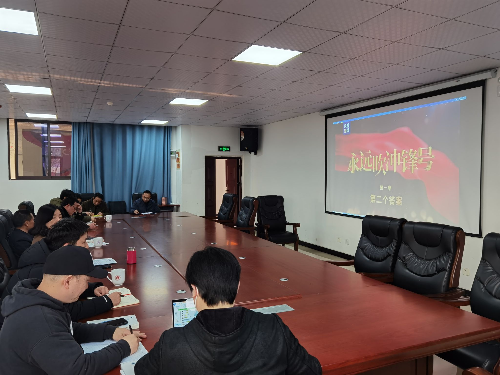 党总支理论学习中心组成员首先集中观看了电视专题片《永远吹冲锋号》第一集《第二个答案》。