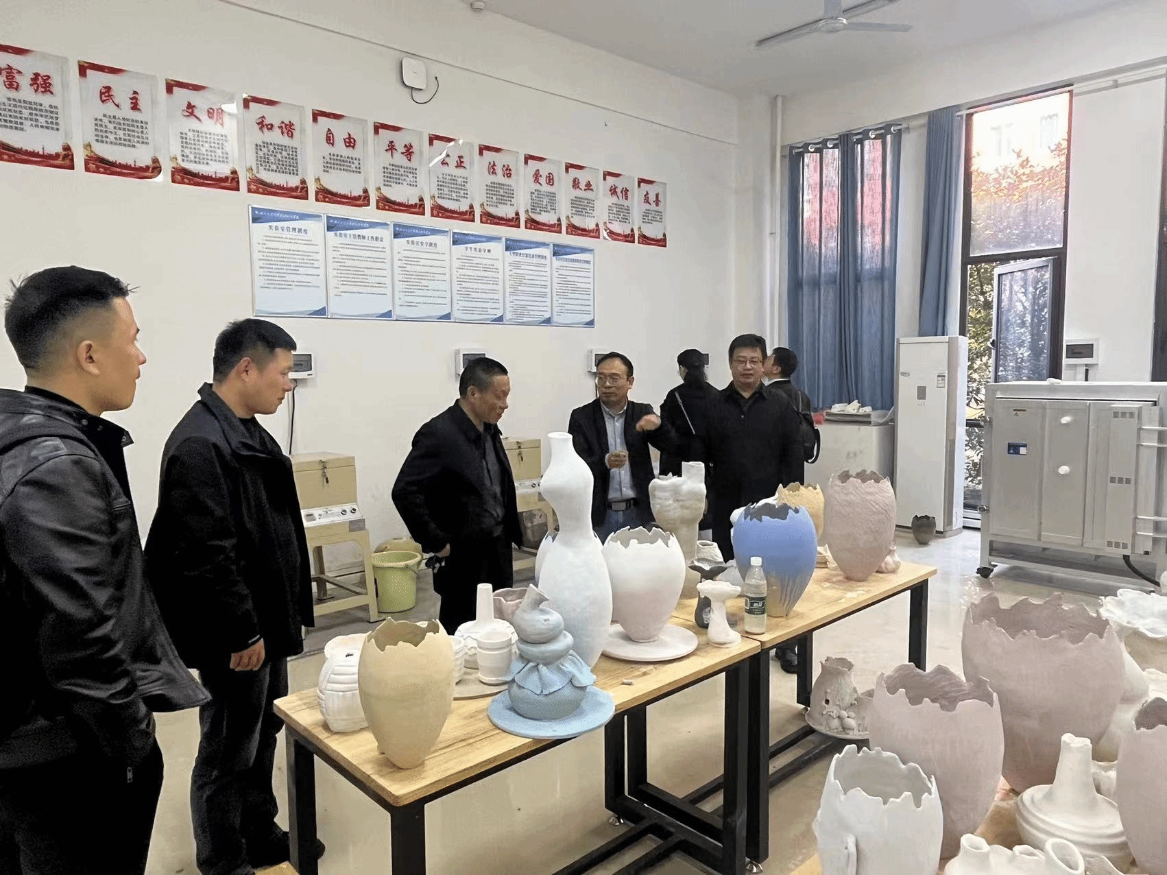 王锋介绍了黔南民族师范学院美术学院的办学现状和当地牙舟陶艺产业情况。他表示,美术学院以牙舟陶实验室为主,是黔南民族师范学院重点培育的现代产业学院。醴陵陶瓷学院在建设现代产业学院上是走在了时代前沿的,拥有先进的办学思路,希望深入学习醴陵陶瓷学院办学模式,特别是在人才培养、校企合作等方面。