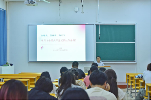 2025年4月28日晚上,学院副院长、教师党支部书记刘井雄在科教楼101为学院入党积极分子开展了专题辅导,他讲授党课《2023年新修订<中国共产党纪律处分条例>解读》。